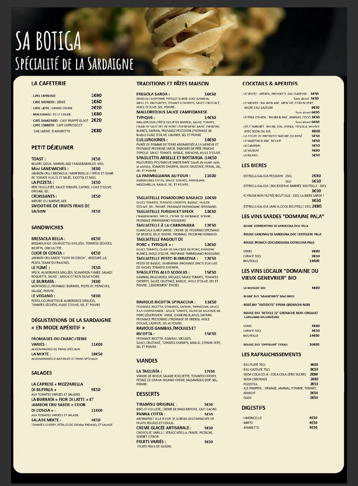 C’est mon 3ème déjeuner chez « Sa Botiga », restaurant Sarde d’où est originaire le jeune chef passionné Cirillo. Directeur de l’établissement, il est à l’écoute de ses clients et son seul plaisir est que nous nous régalions et repartions heureux de son restaurant…pour y re-venir. Ce que je ferai dès ce week-end en famille! J’ai hâte et déjà l’eau à la bouche!!! Les produits y sont frais, les plats goûteux et savoureux, je recommande vivement « Sa Botiga », c’est une belle découverte et expérience culinaire. Un grand MERCI à Monia, son épouse pour sa douceur, gentillesse et patience, je ne suis pas (toujours) une cliente facile… PS: le Central Parking (payant) se trouve à 50m à peine!!! Cela vaut la peine de s’y garer :)